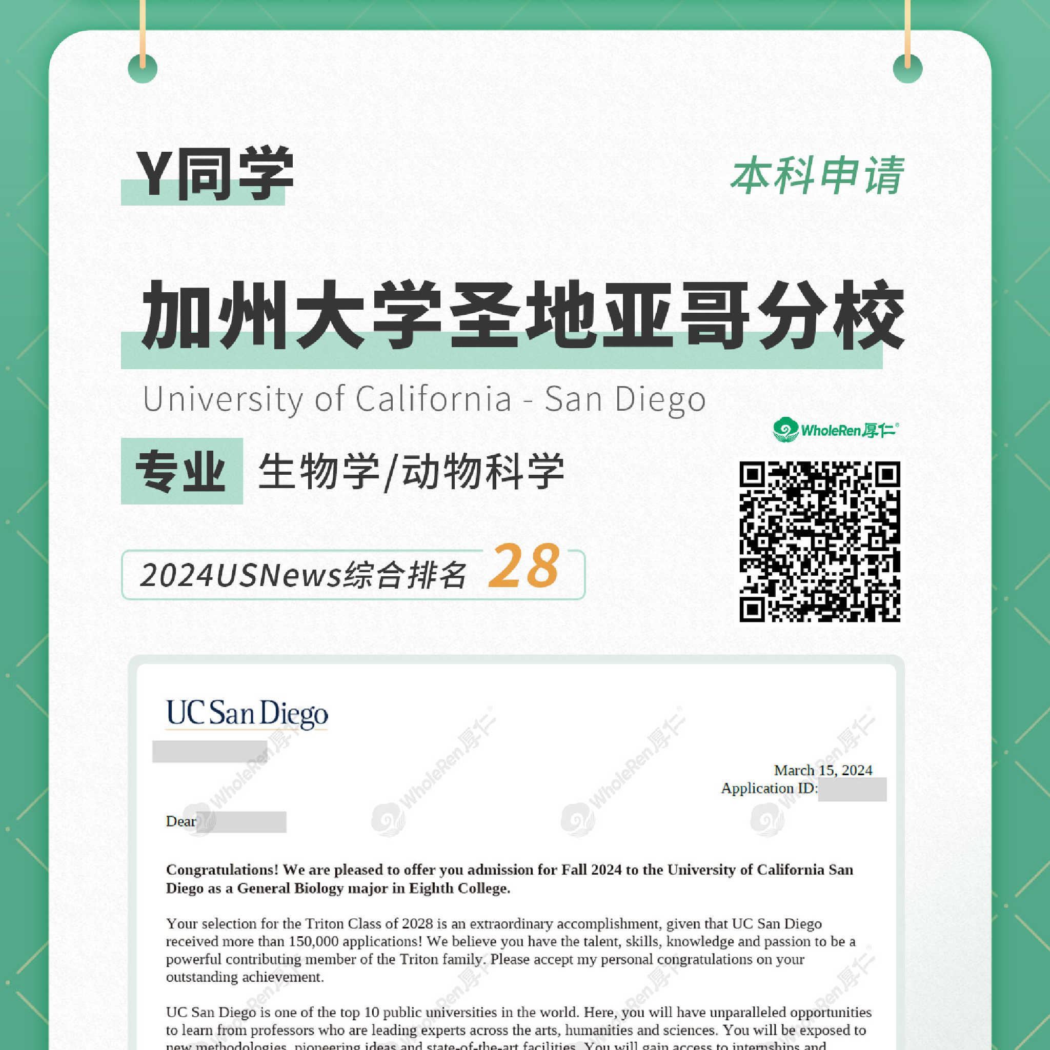 本科申请-Y同学录取UCSD加州大学圣地亚哥分校-生物学/动物科学