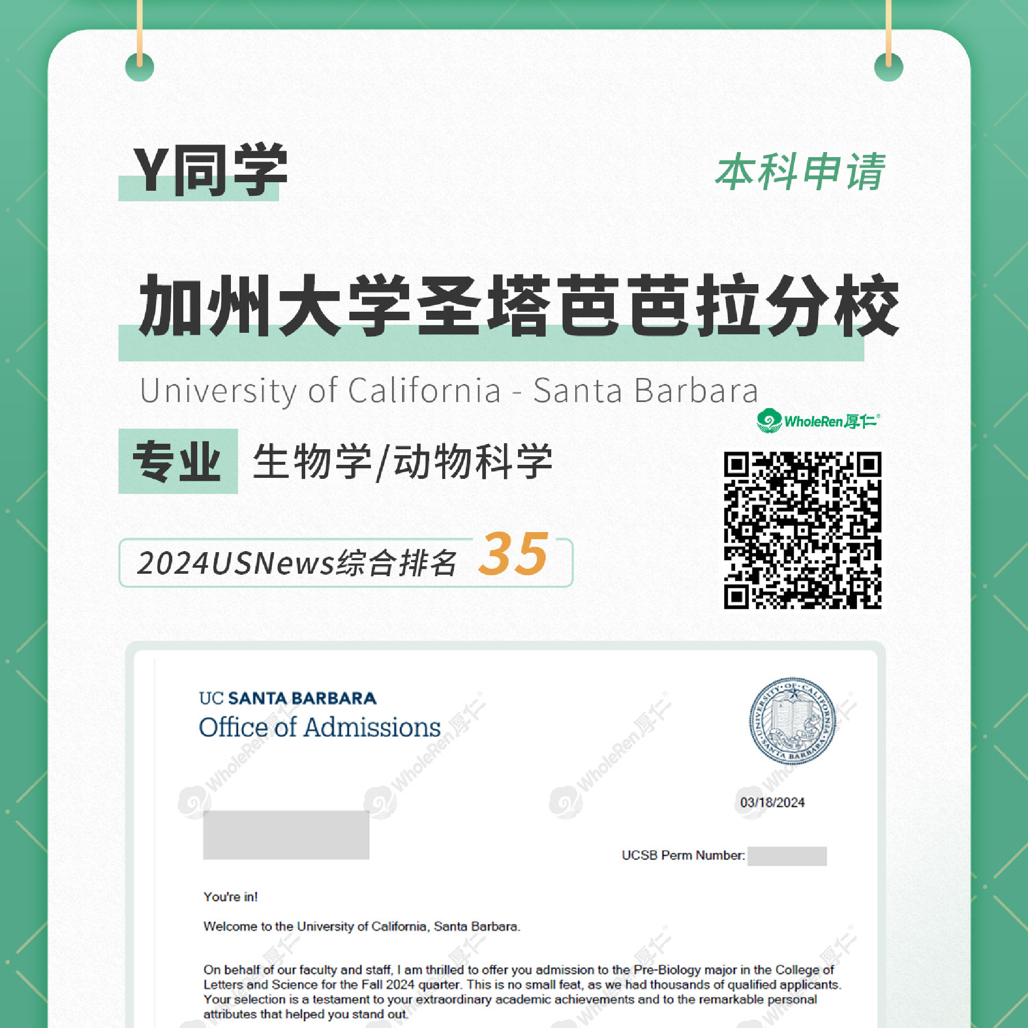 本科申请-Y同学录取UCSB加州大学圣塔芭芭拉分校-生物学/动物科学