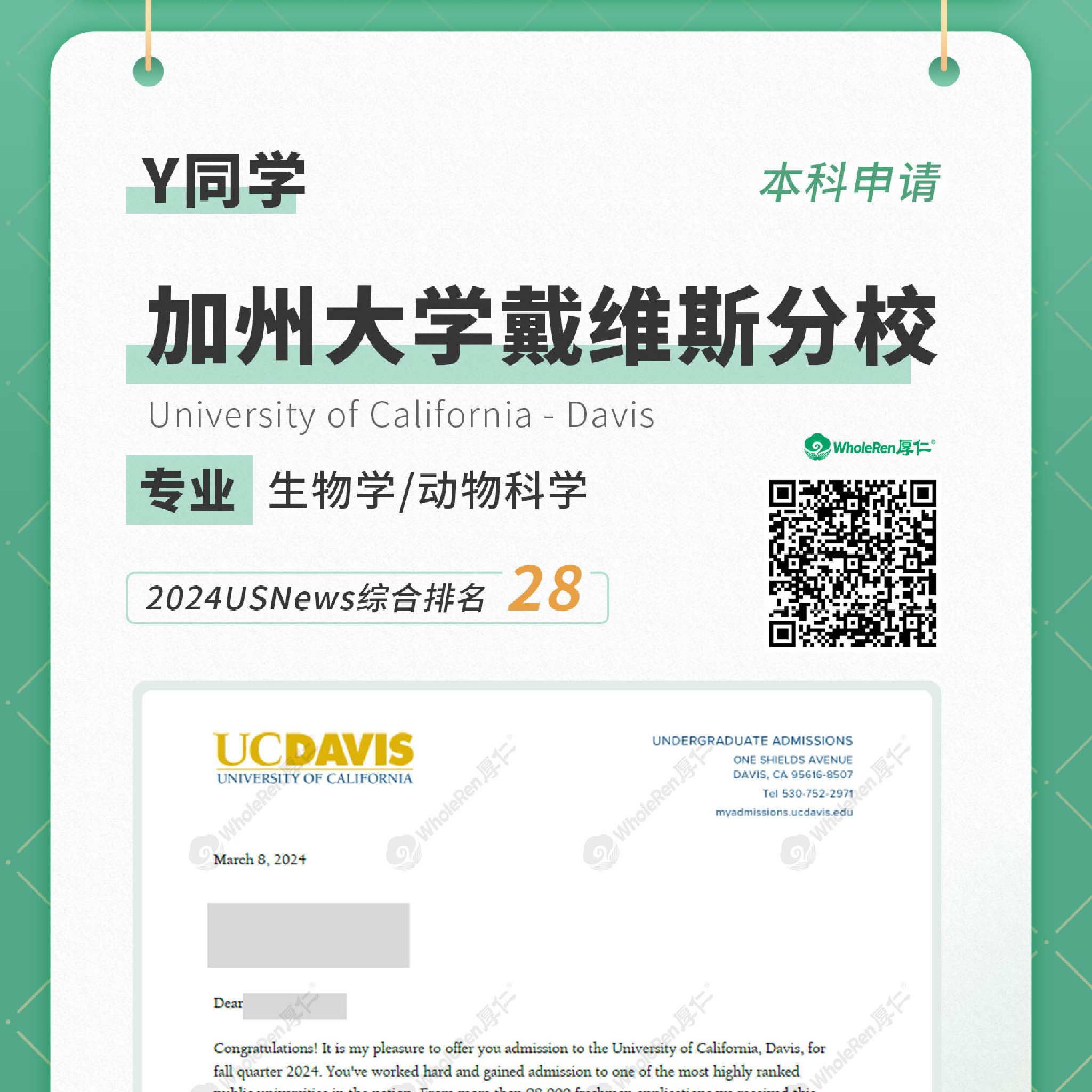 本科申请-Y同学录取UCD加州大学戴维斯分校-生物学/动物科学