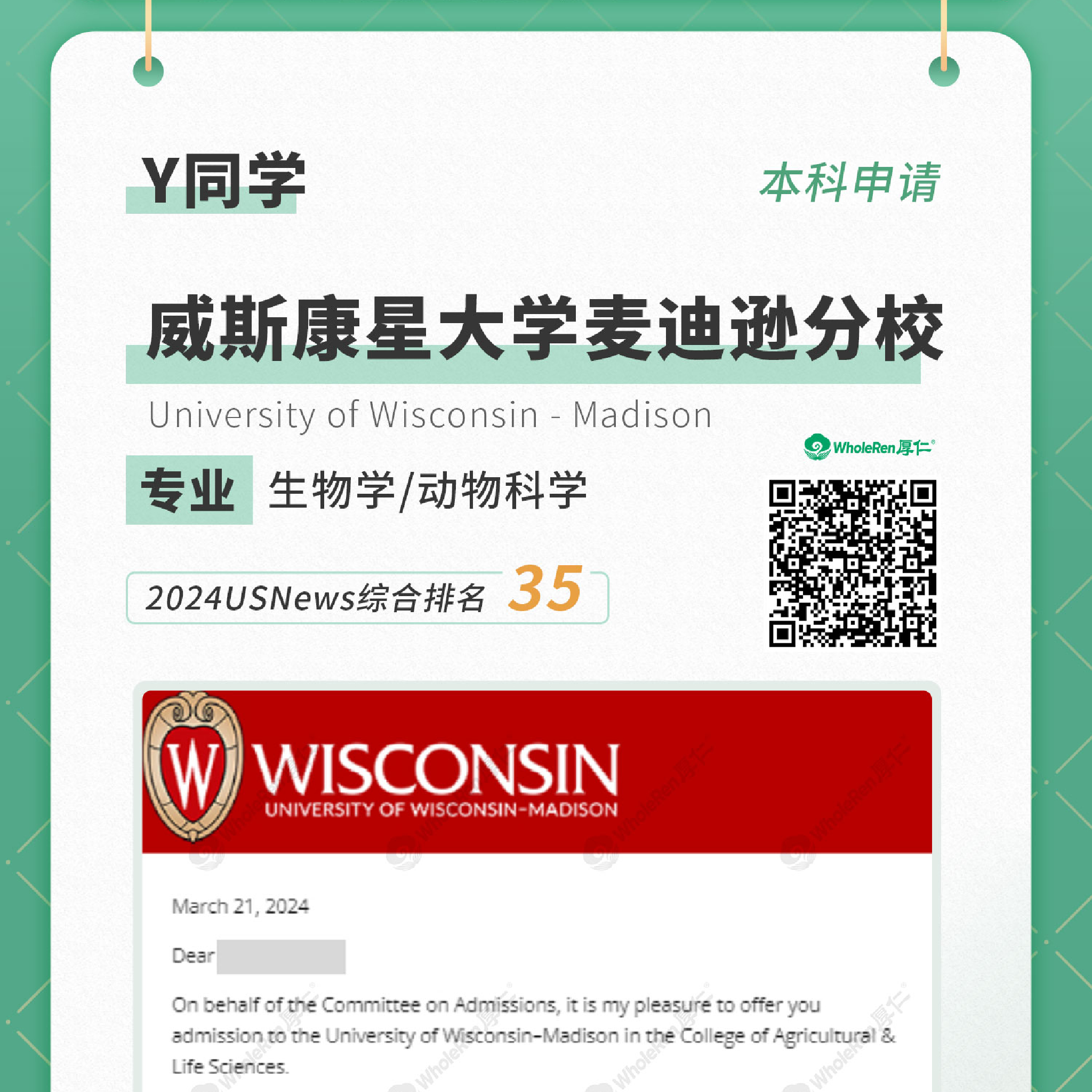 本科申请-Y同学录取UW Madison威斯康星大学麦迪逊分校-生物学/动物科学