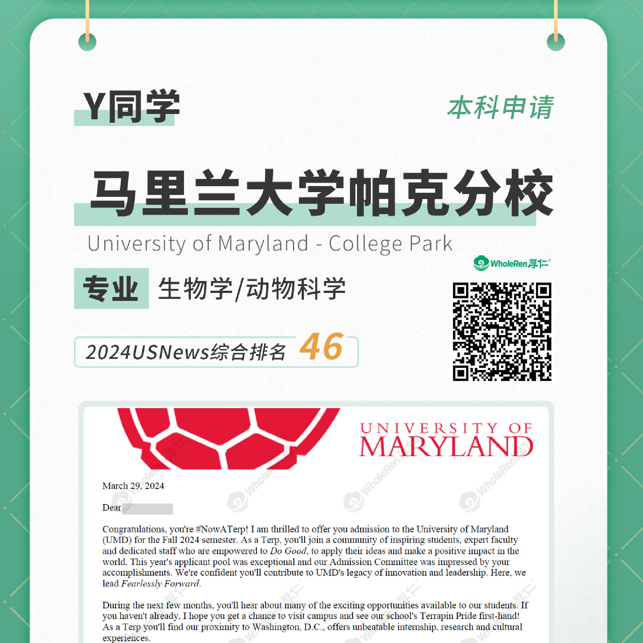 本科申请-Y同学录取马里兰大学帕克分校-生物学/动物科学