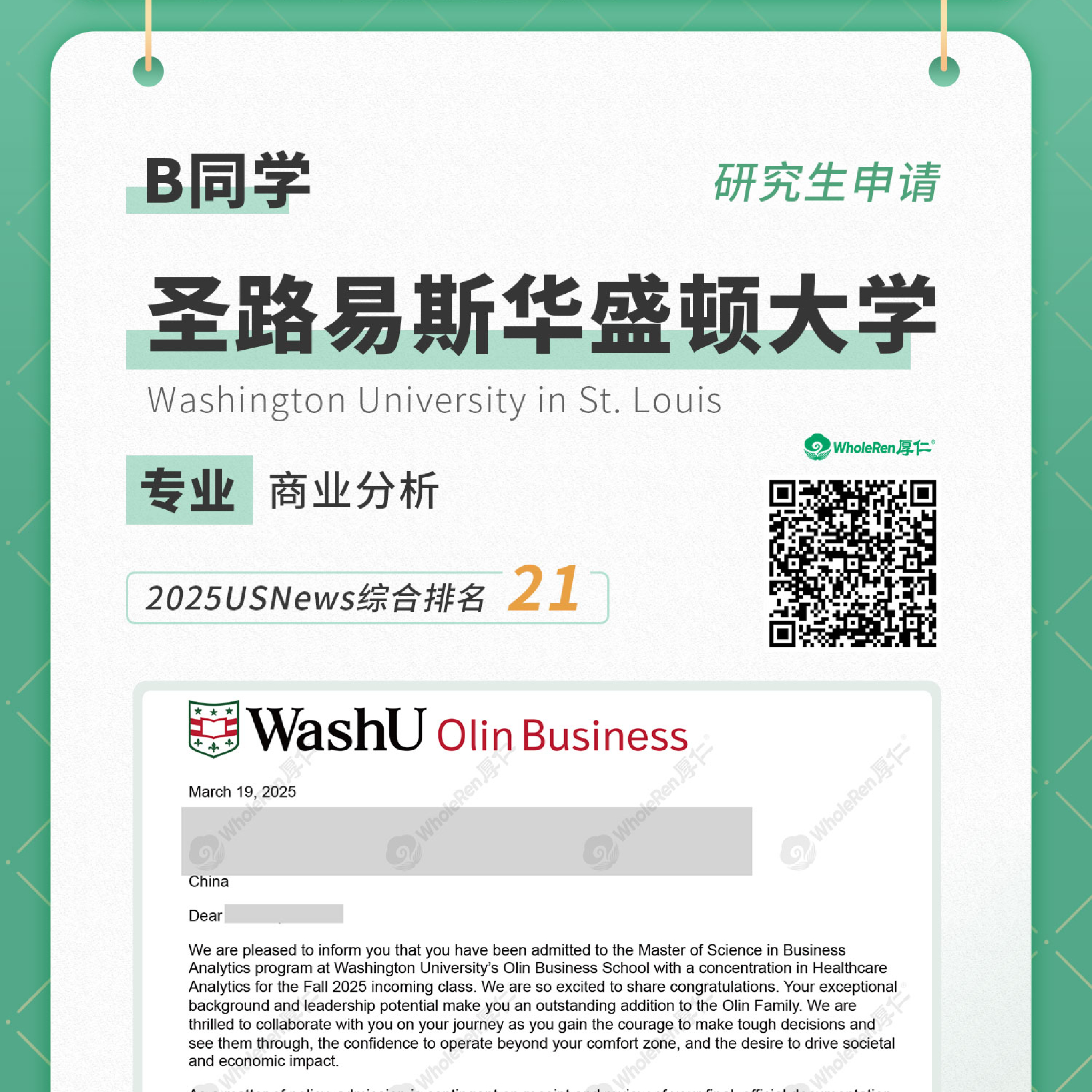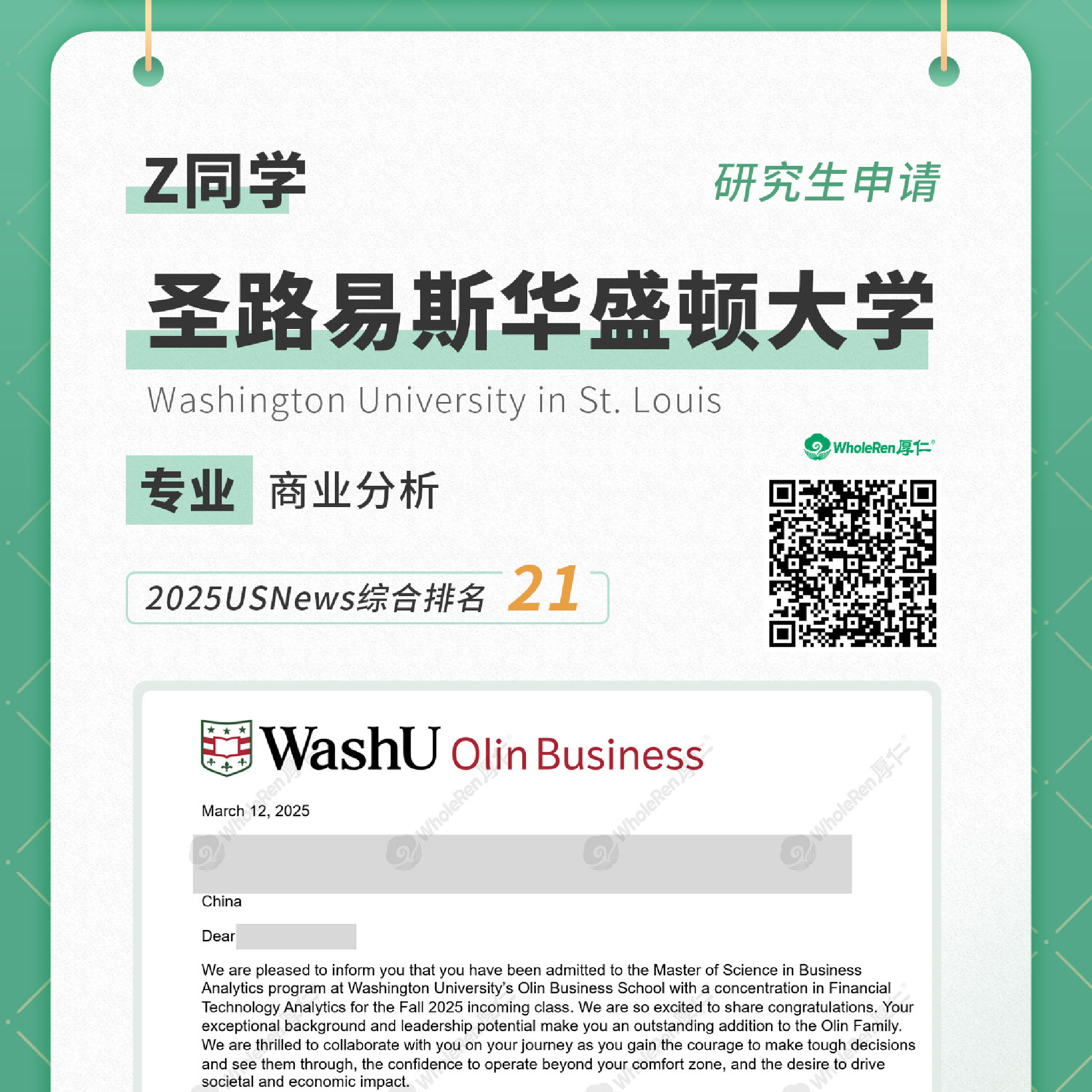 研究生申请-Z同学录取WASHU圣路易斯华盛顿大学-商业分析