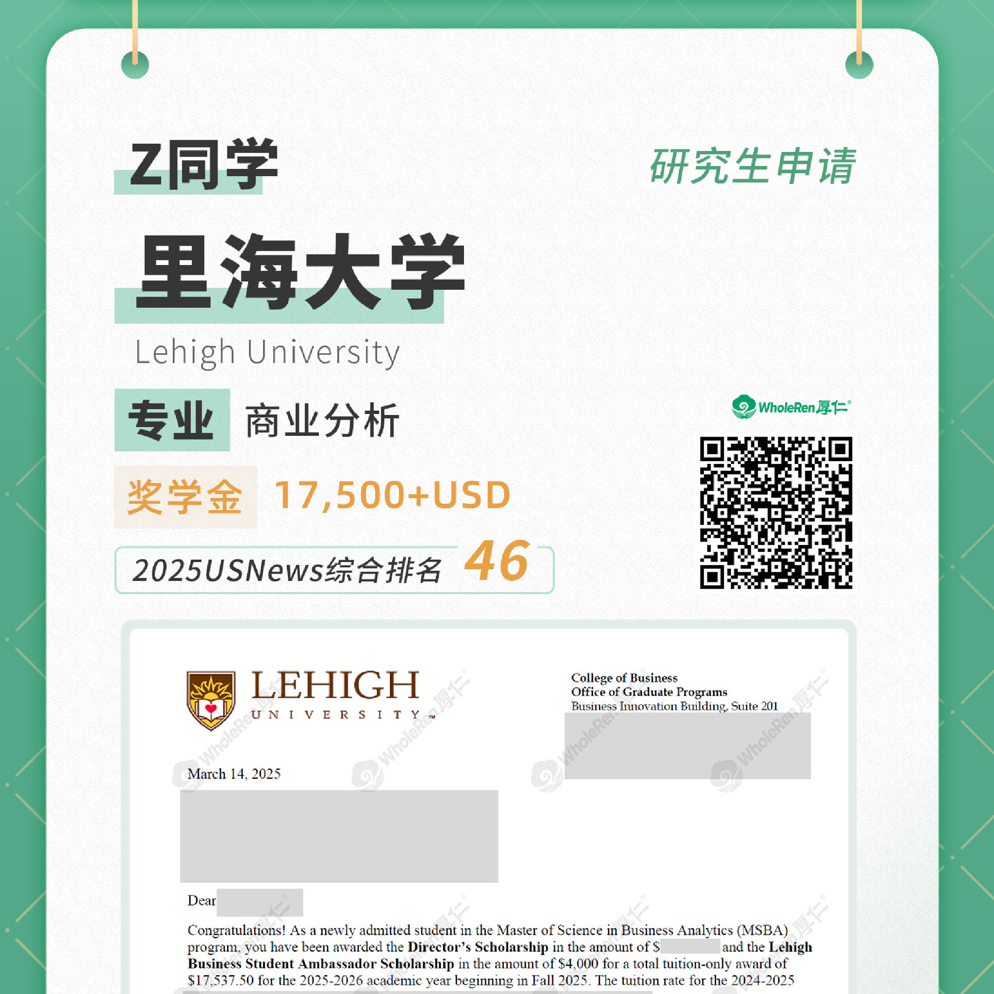 研究生申请-Z同学录取里海大学-商业分析