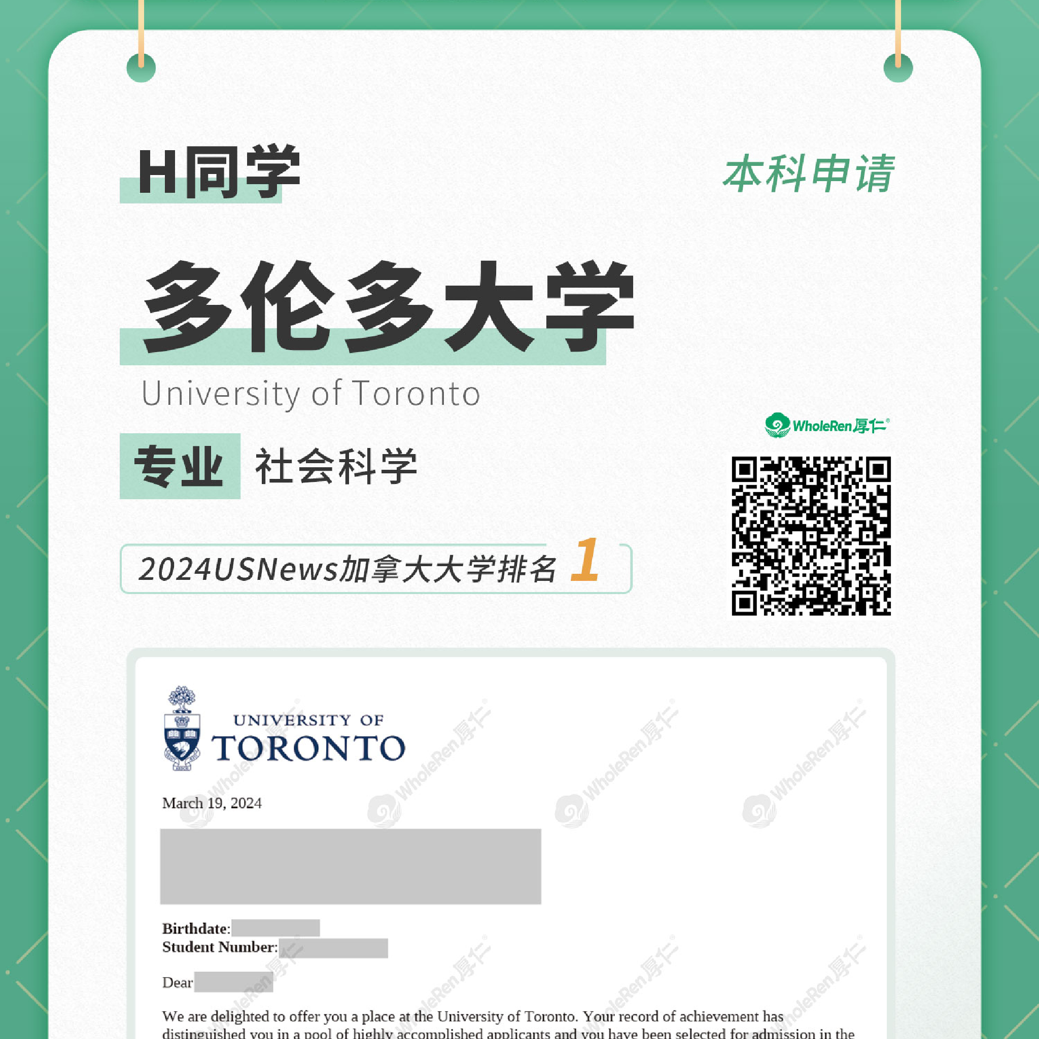 本科申请-H同学录取多伦多大学-社会科学