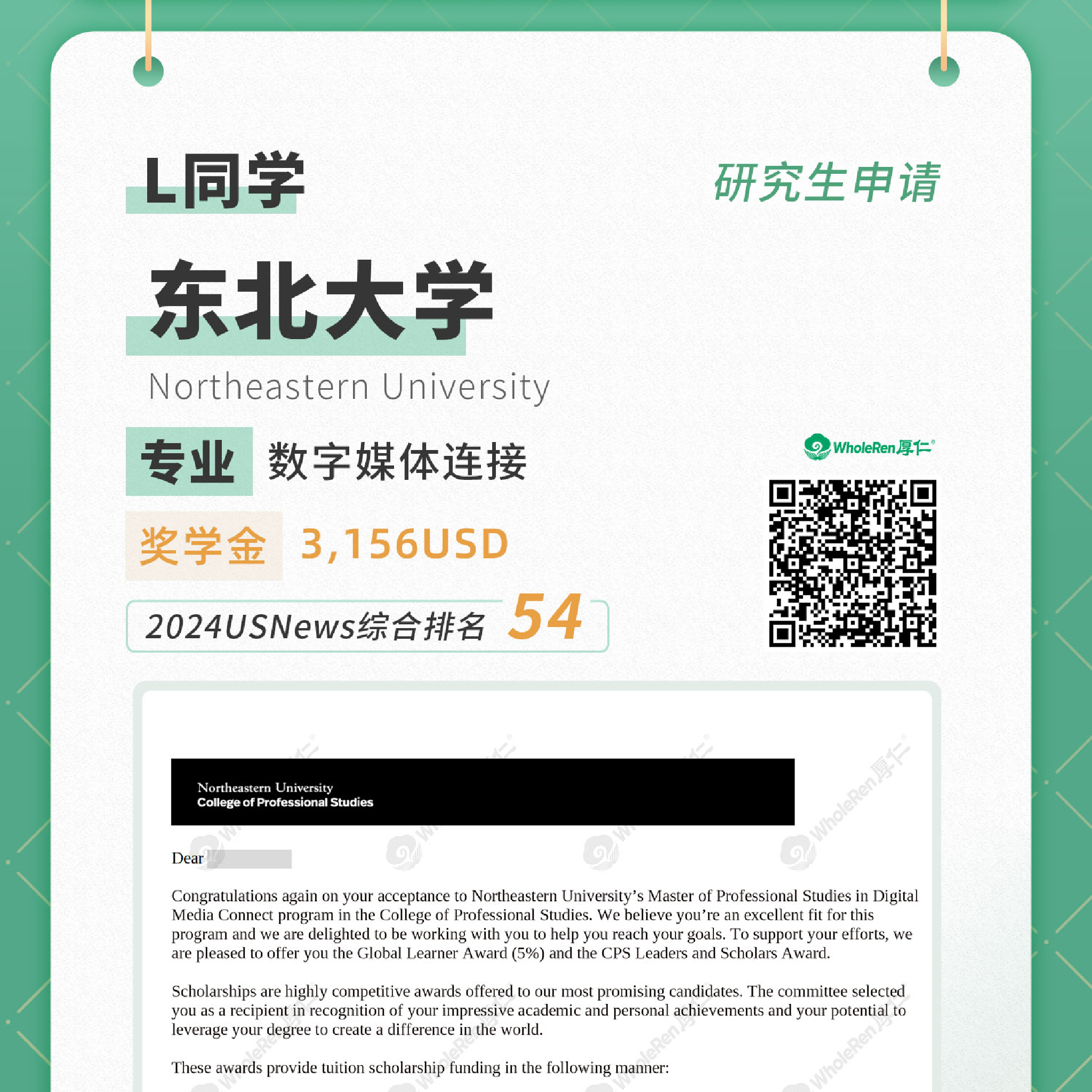 研究生申请-L同学录取东北大学-全球研究与国际关系