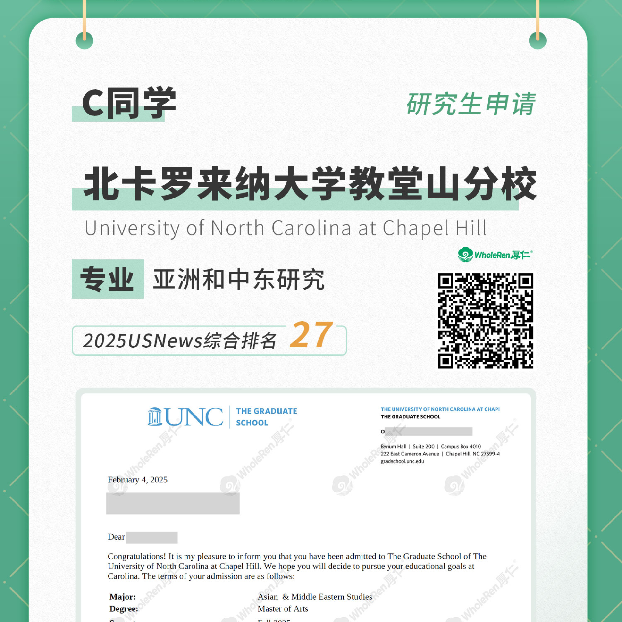 研究生申请-C同学录取北卡罗来纳大学教堂山分校-亚洲和中东研究